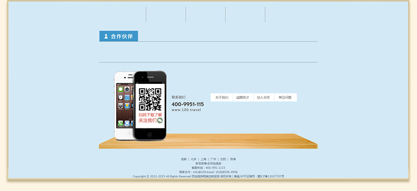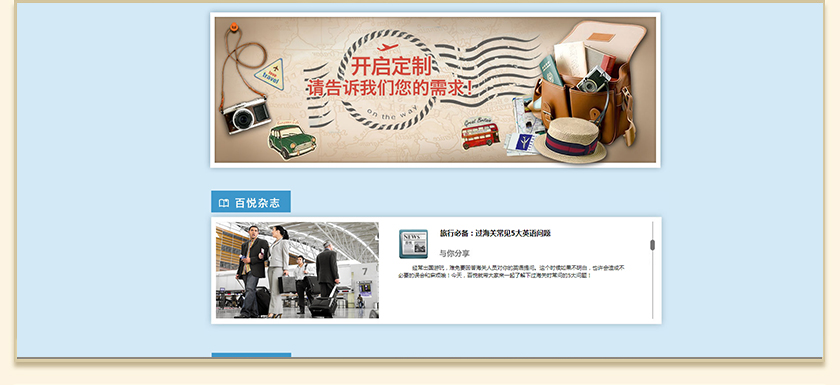 Project Description 百悦逸游于2012年初由二位资深的旅行家创办,是成都传媒集团旗下成都新闻国际旅行社有限公司的高端旅游品牌,总部位于成都高新区天府大道中段美年广场。在百悦逸游成立之前,创始团队亲自到全球三十多个国家实地考察,带着第一手的资讯和执着的信念创立了中国西部第一家真正意义上的私人定制旅行机构。百悦的旅行不是跟团挤大巴,不是十天去十个国家,更不是没完没了的... Official website address 大渡口http://www.100.travel I want to share